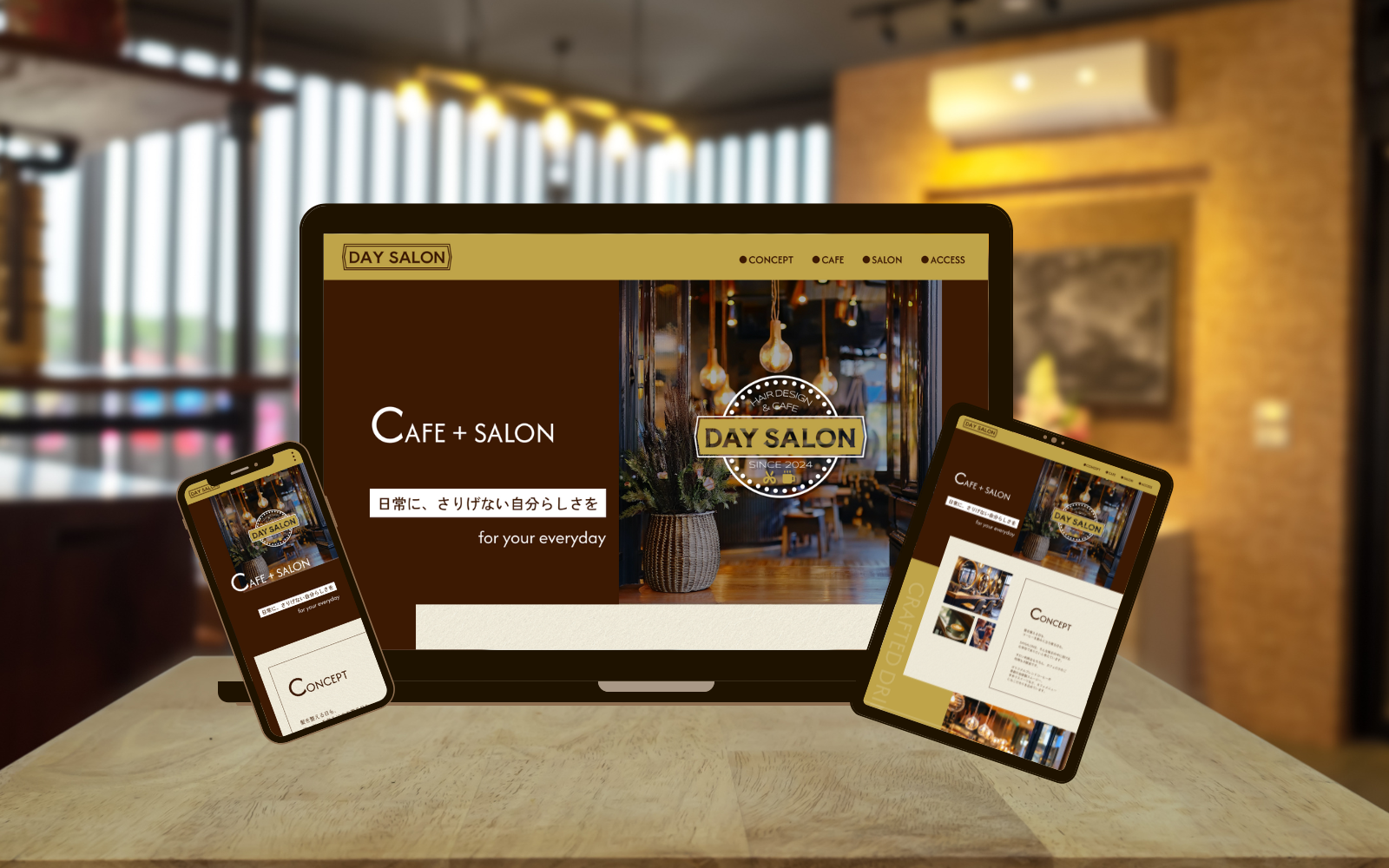 カフェとサロンの世界観を伝えるため、イメージ写真をゆったりとスライドさせ、落ち着いた空間を演出しました。